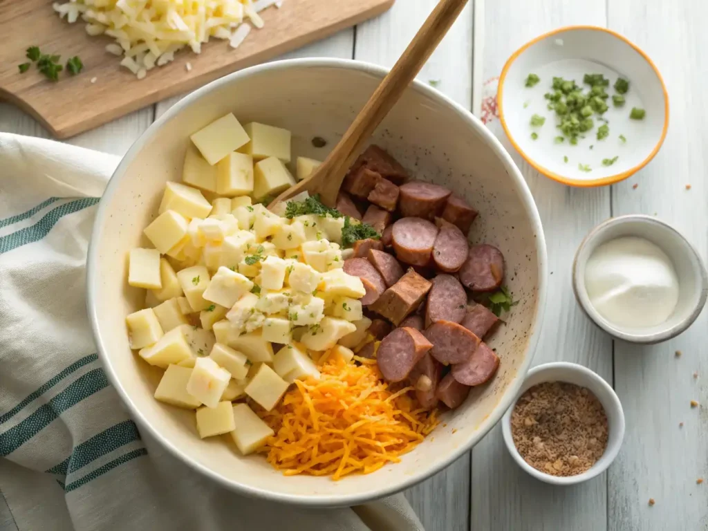 In a large mixing bowl, combine the parboiled potatoes, sliced smoked sausage, shredded cheddar cheese, and one packet of ranch seasoning mix. Add a drizzle of olive oil and toss until everything is evenly coated. For extra creaminess, stir in a spoonful of sour cream or a bit of melted butter before transferring to your baking dish. This blend is what gives Cheesy Ranch Potatoes and Smoked Sausage that signature tangy, cheesy flavor.