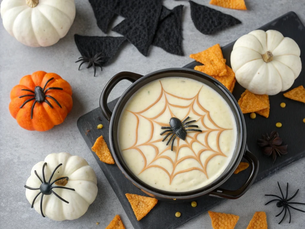 Turn classic queso dip into a creepy-cool centerpiece. Melt white cheese with green chiles, then drizzle sour cream in a web pattern on top. Serve with black tortilla chips for a festive finish. This recipe proves why crockpot Halloween recipes are so popular — they stay warm, creamy, and irresistibly gooey throughout the night.